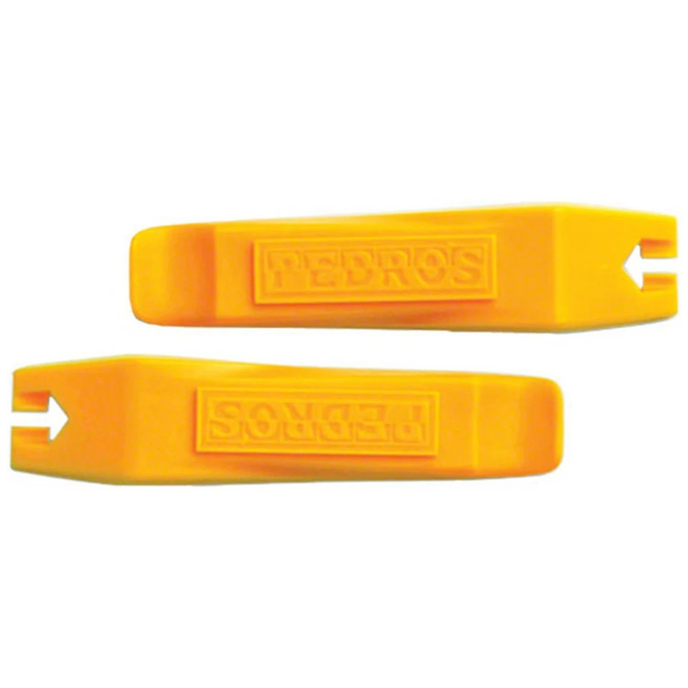 Pedros Dækjern i gul, lavet i en stærk plastik komposit, og med en udformning der gør det let at komme under og få fat på dækket. i den anden ende er der kroge til at sætte dækjernet fast på en eger.